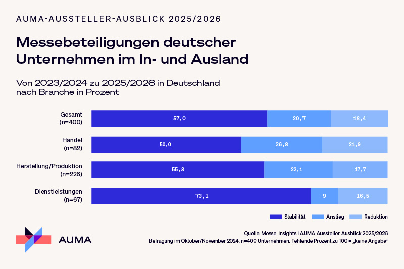 Berlin, 17. Februar 2025 | Messebeteiligungen von Unternehmen aus Deutschland bleiben stabil – im Vergleich zum Vorjahr sorgt der anhaltende Mix aus Rezession, Inflation und politischen Unsicherheiten jedoch für zunehmende Dynamik bei der Entscheidung für die Teilnahme an Messen. Das zeigt der neue AUMA-Aussteller-Ausblick 2025/2026, der einmal im Jahr den Puls der ausstellenden Wirtschaft in Deutschland misst.