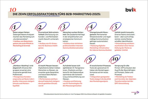 Die deutsche Wirtschaft steht vor großen Herausforderungen. Maßgebliche Faktoren sind die „vier D“: demografischer Wandel, Digitalisierung, Dekarbonisierung und De-Globalisierung. Unternehmen müssen sich anpassen, um wettbewerbsfähig zu bleiben. Dabei spielt das Marketing eine zentrale Rolle, indem es Veränderungen unterstützt und zum Treiber des Wandels wird. Künstliche Intelligenz (KI) und internes Wissensmanagement eröffnen zusätzlich neue Horizonte für Messeauftritte. Anhand von fünf Thesen beleuchtet der bvik Bundesverband Industrie Kommunikation in seinem „Trendpaper 2025“ die zentrale und sich verändernde Rolle des Marketings. Das Papier schließt mit der Definition von zehn Erfolgsfaktoren fürs B2B-Marketing 2025.