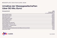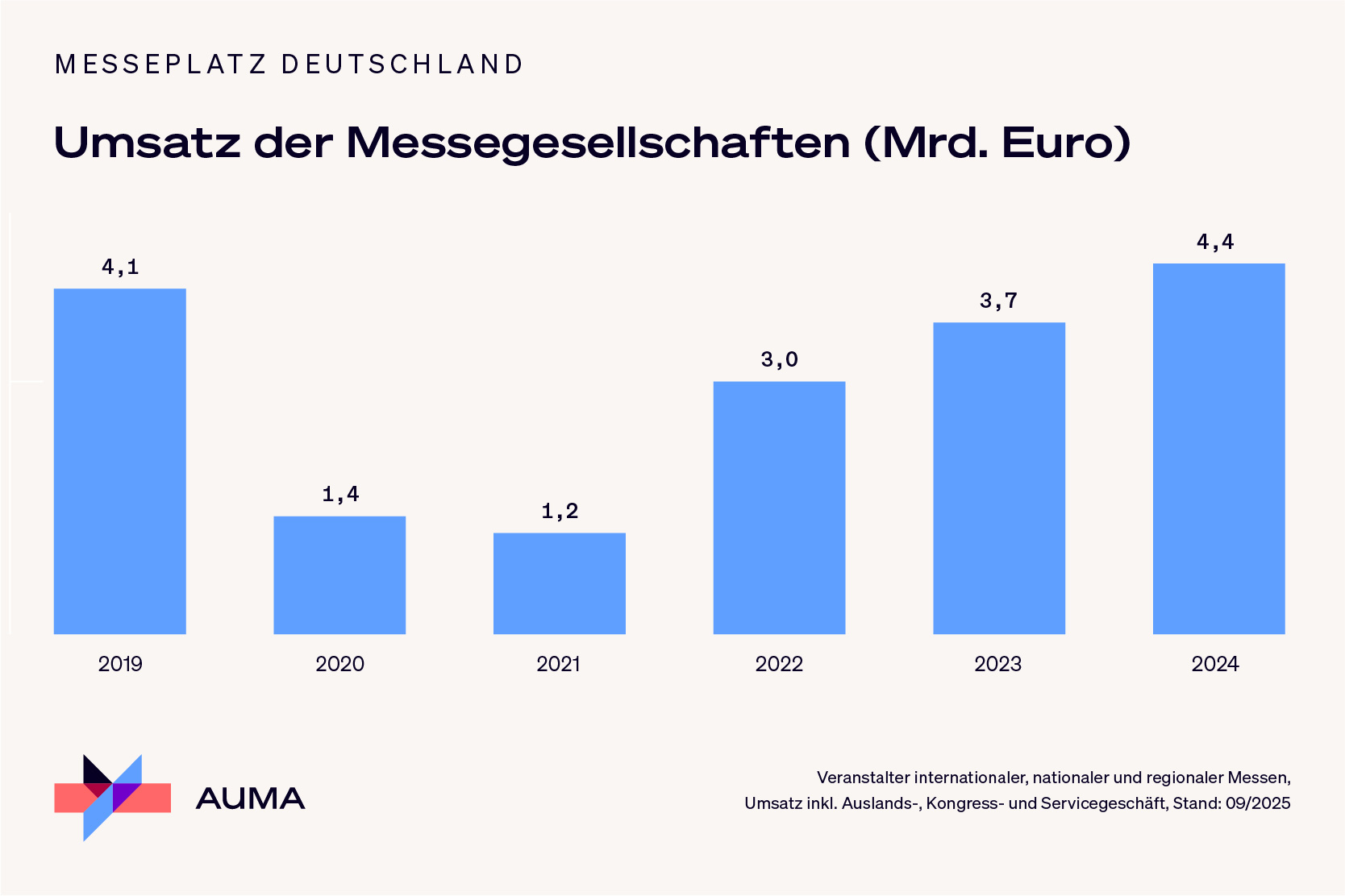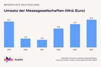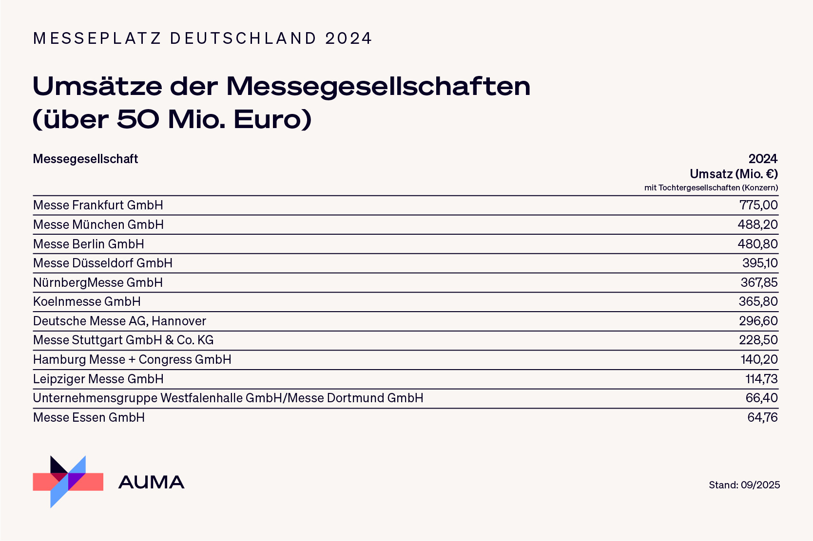 Von den mehr als 300 geplanten Messen in Deutschland im Jahr 2025 haben in den ersten neun Monaten knapp 230 stattgefunden, 76 sind für das vierte Quartal vorgesehen. Angesichts der aktuellen wirtschaftlichen Herausforderungen, geopolitischer Krisen sowie turnusbedingter Effekte erwartet der AUMA für 2025 einen Umsatz, der leicht unter dem Vorjahresniveau liegen wird. 2024 erzielten die AUMA-Mitgliedsgesellschaften mit 4,4 Milliarden Euro Umsatz ein Rekordergebnis. Damit setzte sich das Wachstum der Branche fort. Zwölf von 16 Unternehmen meldeten Erlöse von über 50 Millionen Euro. Spitzenreiter ist die Messe Frankfurt GmbH mit mehr als 770 Millionen Euro. Das Jahresergebnis 2024 zeigt außerdem, dass das Niveau der Vor-Corona-Jahre wieder erreicht ist: In Spitzenzeiten lag der Jahresumsatz bei 4,1 Milliarden Euro (2019). Den Tiefpunkt während der Coronajahre markierte 2021 mit 1,2 Milliarden Euro.