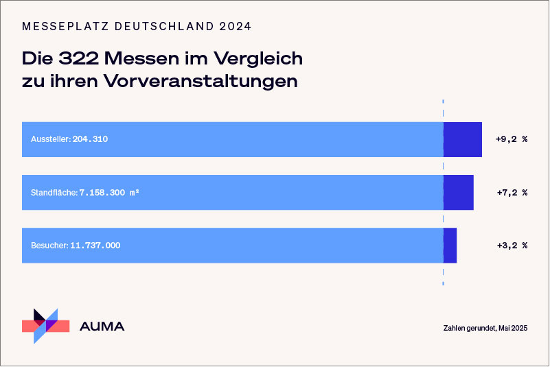 Rund 70 Messeplätze in Deutschland boten mehr als 204.000 ausstellenden Unternehmen eine Plattform – ein Zuwachs von 9,2 Prozent gegenüber den jeweiligen Vorveranstaltungen. Über 11,7 Millionen Besucherinnen und Besucher wurden gezählt, was einem Plus von 3,2 Prozent entspricht. Auch die belegte Standfläche stieg deutlich auf knapp 7,2 Millionen Quadratmeter (+7,2 Prozent).