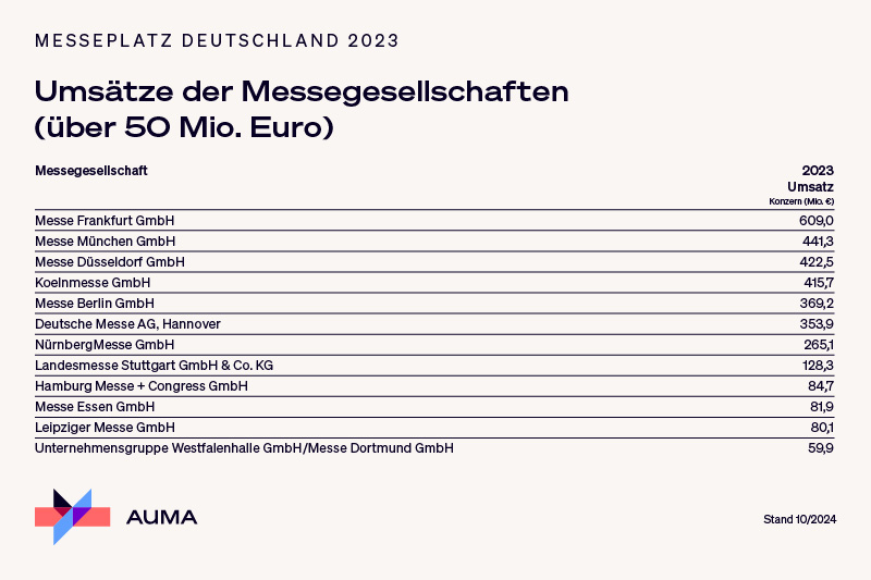 Im Jahr 2023 erzielten die Messegesellschaften aus der AUMA-Mitgliedschaft 3,7 Milliarden Euro Umsatz. Zwölf von 16 meldeten einen Umsatz über 50 Millionen Euro. Platz eins im Ranking nimmt die Messe Frankfurt GmbH ein mit mehr als 600 Millionen Euro. Das Jahresergebnis 2023 stellt bereits eine deutliche Steigerung gegenüber den Werten der von Corona betroffenen Messejahre 2020 bis 2022 dar. Der geringste Jahresumsatz in dieser Periode wurde mit 1,2 Milliarden Euro (2021) erzielt.