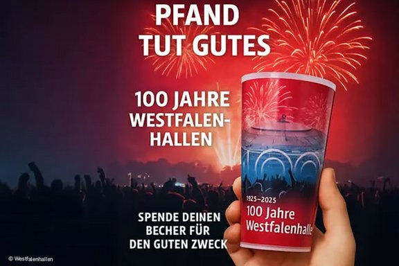 Das Jubiläum zum 100. Bestehen der Westfalenhallen steht ganz im Zeichen des gemeinsamen Erlebens und des Miteinanders. Seit März 2025 ruft die Westfalenhallen Unternehmensgruppe Besucherinnen und Besucher dazu auf, Pfandbecher nach Veranstaltungen nicht zurückzugeben, sondern für einen guten Zweck zu spenden. Unter dem Motto „Setze ein Highlight – spende deinen Pfandbecher!“ sind bei Events auf dem Gelände insgesamt 14 Sammelboxen in der Westfalenhalle sowie den Hallen 1 und 2 im Umlauf.
