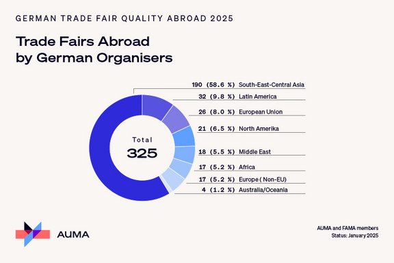 Berlin, 31 January 2025 / In the current year, German trade fair companies are planning 325 trade fairs in almost 40 countries, significantly more than in the two previous years. This is according to a recent survey by the Association of the German Trade Fair Industry (AUMA). Many of these projects are satellites to trade fairs that have been successfully organised in Germany for years. With their renowned trade fair concepts and their networks in important regions of the world, the domestic trade fair companies offer German SMEs new export opportunities. All foreign trade fairs organised by AUMA members can now be found in the trade fair database.