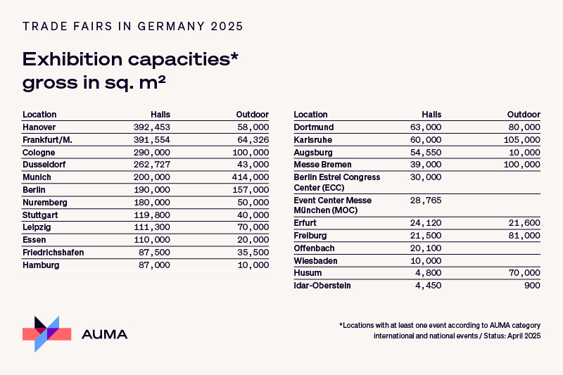 According to the AUMA survey, around 3.25 million square metres of hall space are currently available at exhibition venues in Germany. The 24 exhibition venues of national or international significance account for 2.78 million square metres of hall space. Trade fair and exhibition venues considered to be of regional importance have a gross hall area of just under 468,000 square metres. In total, there are around 70 exhibition centres in Germany, hosting around 350 trade and public fairs every year.