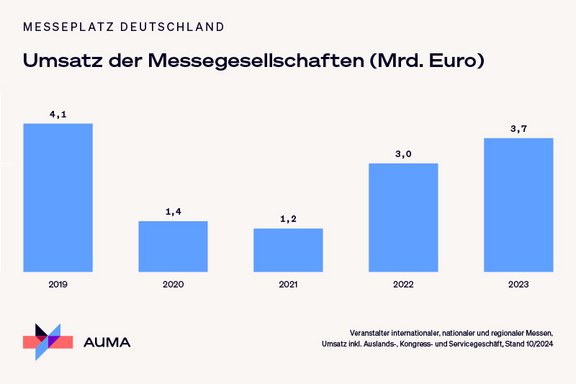 In 2023, the trade fair companies from the AUMA membership generated sales of EUR 3.7 billion. Twelve out of 16 reported sales of over 50 million euros. Messe Frankfurt GmbH takes first place in the ranking with more than 600 million euros. The annual result for 2023 already represents a significant increase compared to the figures for the trade fair years 2020 to 2022 affected by coronavirus. The lowest annual turnover in this period was achieved with 1.2 billion euros (2021).