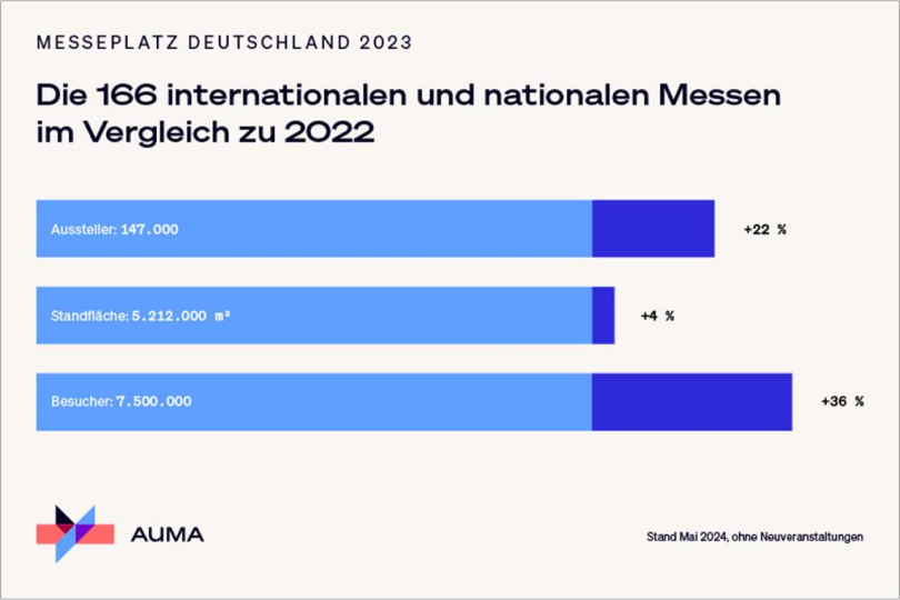 Rund 70 Messeplätze in Deutschland boten mehr als 204.000 ausstellenden Unternehmen eine Plattform – ein Zuwachs von 9,2 Prozent gegenüber den jeweiligen Vorveranstaltungen. Über 11,7 Millionen Besucherinnen und Besucher wurden gezählt, was einem Plus von 3,2 Prozent entspricht. Auch die belegte Standfläche stieg deutlich auf knapp 7,2 Millionen Quadratmeter (+7,2 Prozent).