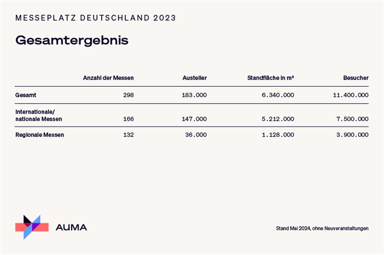 An den 138 regionalen Veranstaltungen im Messejahr 2024 beteiligten sich knapp 40.000 ausstellende Unternehmen. Sie belegten eine Standfläche von rund 1,3 Millionen Quadratmetern und zogen etwa 4,5 Millionen Besucherinnen und Besucher an. Im Vergleich zu den jeweiligen Vorveranstaltungen ist ein leichtes Plus zu verzeichnen: die Zahl der Aussteller ist um 1,7 Prozent gestiegen. Die vermietete Standfläche ist minimal um 0,2 Prozent gewachsen. Die Besucherzahlen sind hingegen gesunken: Hier wurde ein Minus von rund 3 Prozent verzeichnet.